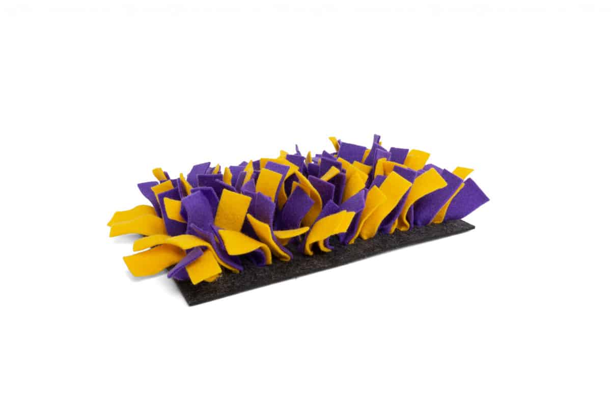 De Bunny Nature Snuffelmat Vilt Paars / Geel is interactief speelgoed voor konijnen, cavia’s, ratten, hamsters en andere knaagdieren, voor fysieke en mentale uitdaging met snacks als beloning. Jouw konijn of kleine knager hoeft zich niet meer te vervelen met deze leuke Snuffelmat van Bunny Nature! Konijnen en andere knaagdieren als cavia’s, ratten, hamsters en muizen foerageren in de natuur veel op zoek naar voedsel, waarmee zij uren per dag bezig zijn. Jij kunt nu aan die behoefte voldoen met deze vrolijk gekleurde snuffelmat. De snuffelmat is gemaakt van vilt en bestaat uit een bodem met daarop slierten waartussen snacks en voer verstopt kunnen worden. Jouw dier zal al zijn zintuigen aan moeten spreken om de verstopte lekkernijen tussen de slierten te vinden. Jouw dier is zo actief bezig met het zoeken naar zijn beloning, wat verveling tegengaat en zorgt voor mentale uitdaging. Door jouw dier te begeleiden bij het zoeken naar zijn beloning en samen te spelen, versterk je bovendien de onderlinge band.